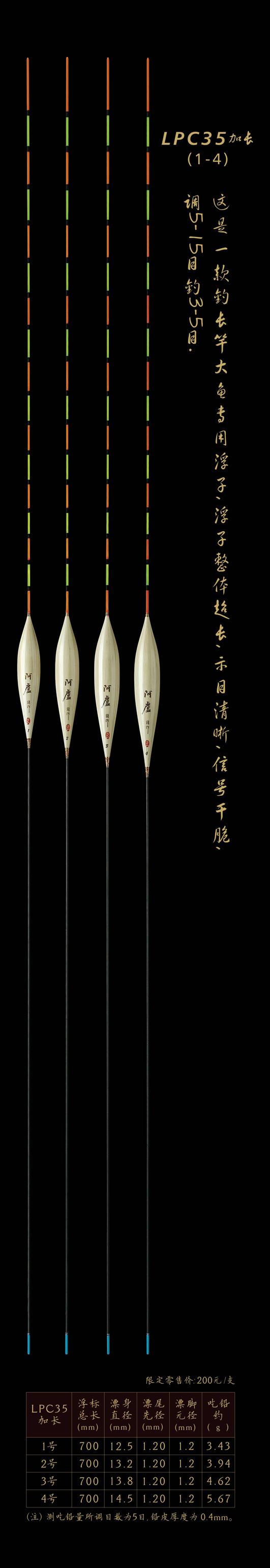 LPC35加長:釣長竿大魚專用浮子,浮子整體超長,示目清晰,信號干脆,調(diào)5—15目釣3—5目。