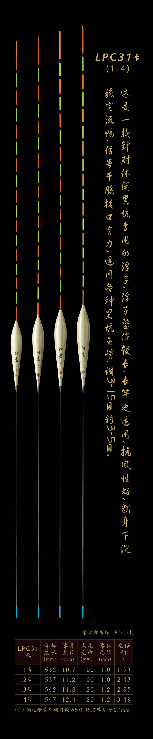 LPC31長:是一款針對休閑黑坑專用的浮子,浮子整體較長,長竿也適用,抗風(fēng)性好,翻身下沉穩(wěn)定流暢,信號干脆接口有力,適用各種黑坑魚情,調(diào)3—15目,釣3—5目。