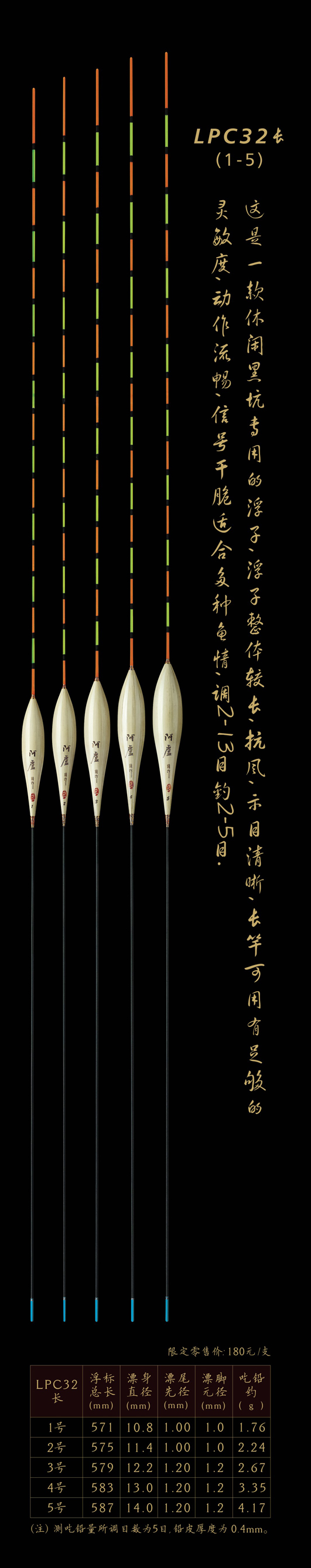 LPC32長:是一款休閑黑坑專用的浮子,浮子整體較長,抗風(fēng),示目清晰,長竿可用有足夠的靈敏度,動作流暢,信號干脆適合多種魚情,調(diào)2—13目,釣2-5目。