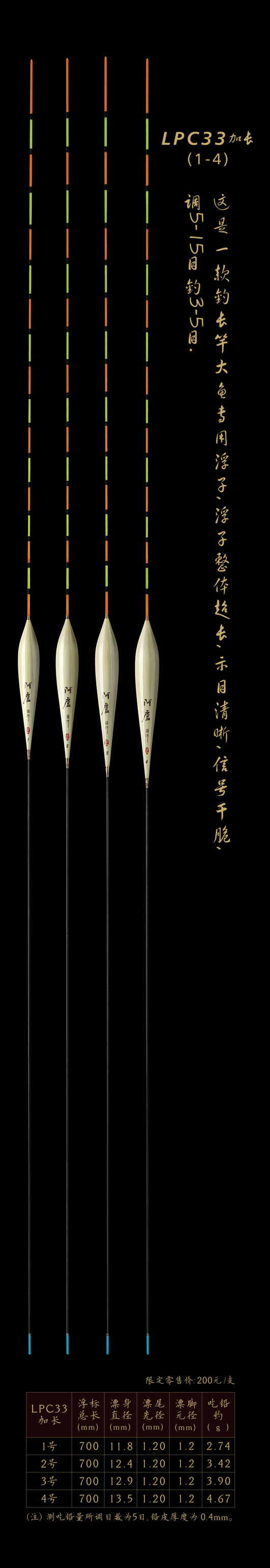 LPC33加長:釣長竿大魚專用浮子,浮子整體超長,示目清晰,信號干脆,調(diào)5—15目釣3—5目。