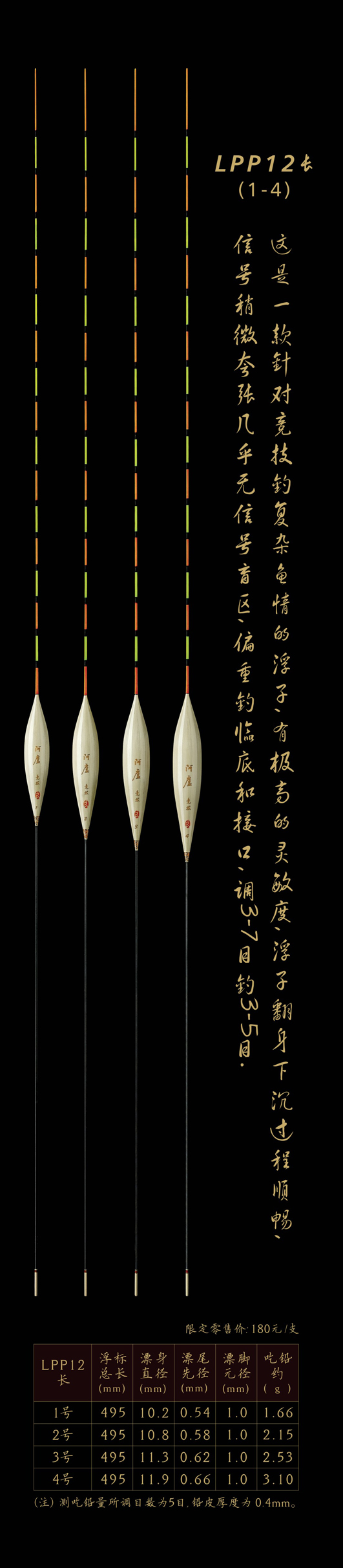 LPP12長:這是一款針對競技釣復(fù)雜魚情的浮子,有極高的靈敏度,浮子翻身下沉過程順暢,信號稍微夸張幾乎無信號盲區(qū),偏重釣臨底和接口,調(diào)3—7目,釣3—5目。